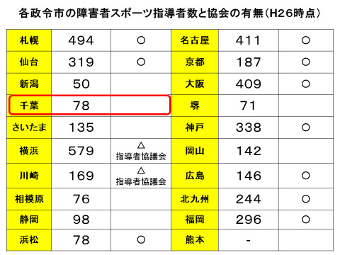 そこで、私自身、平成26年以降、3度に渡り議会質問で「練習場所の確保や指導者の育成を初め、関連団体の声を的確に把握するためにも、障害者スポーツ協会の設立を進めるべきである」と訴えてまいりました。(当時の状況は表の通り)