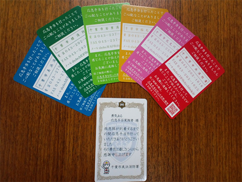 そのため、救急現場で勇気をもって応急手当をされた方への感謝の気持ちと、事後の心的ストレスなどをサポートする相談窓口を掲載した「応急手当感謝カード」を救急現場で救急隊や消防隊から配布することとなりました。(3年前に実施へ!)