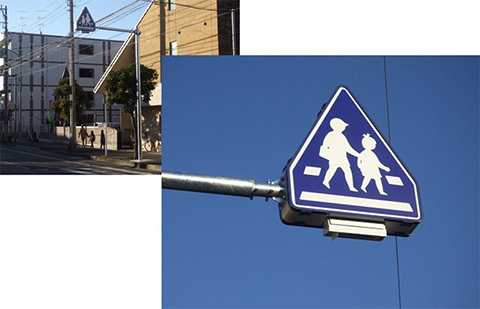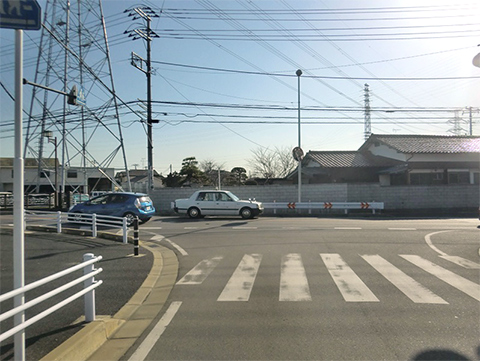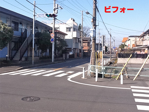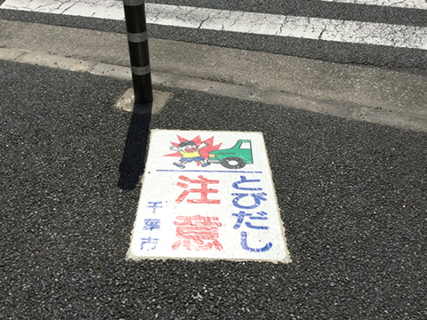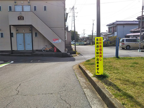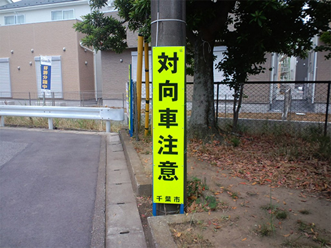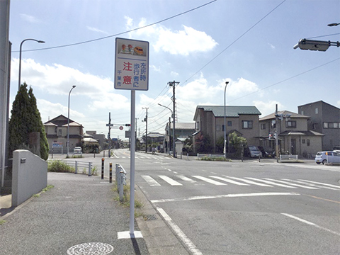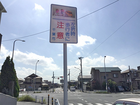 2丁目交差点の左折注意看板、飛び出し注意シール設置