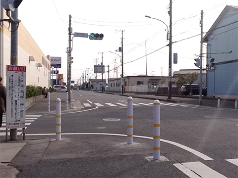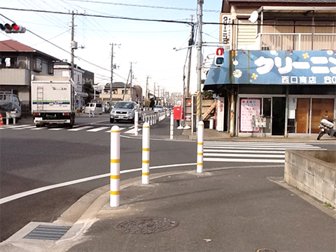 塩浜橋バス停近くの路面表記、車止めポールの設置
