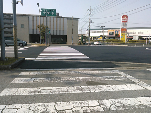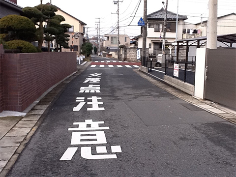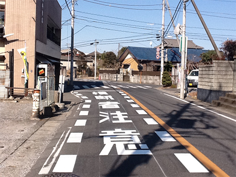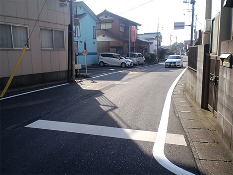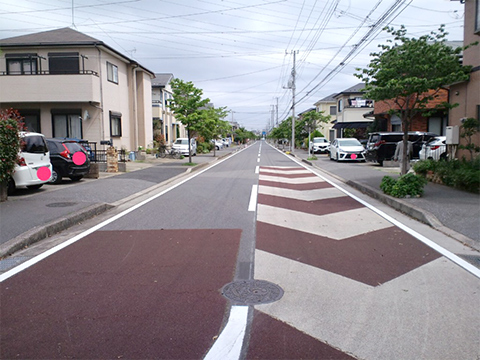 (※歩道を広く、車道を狭く線を引くことにより、行き交う車が速度を緩めるようになりました。)