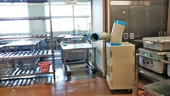 現在では各校に2台配備され、平常時は調理室(給食室)で、災害時は避難所となる体育館で使用されます。