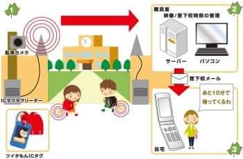 同システムは、無料のICタグを児童に配布し、読み取り機及び専用防犯カメラを通用門に設置することにより、子どもたちの登下校状況を把握し、希望する保護者には都度メール配信するもシステムで、「子どもたちが“いつ、誰と、どのように”登下校したのか」を学校が把握し、保護者からの問い合わせにも対応できるようにするものです。
